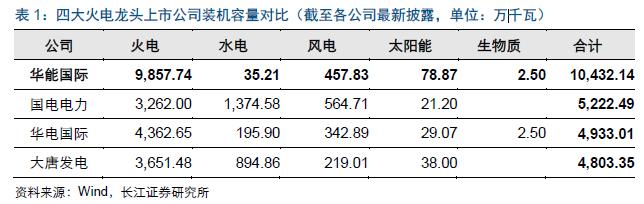 華能國(guó)際是火電上市公司的第一龍頭,截至2017年底燃煤裝機(jī)容量達(dá)到8732.5萬(wàn)千瓦,占全國(guó)燃煤電廠裝機(jī)比重8.91%;境內(nèi)火電裝機(jī)(燃煤+燃?xì)獍l(fā)電)裝機(jī)容量達(dá)到9596.8萬(wàn)千瓦,占全國(guó)火電裝機(jī)比重的8.68%,其總裝機(jī)容量超過(guò)排名第二的國(guó)電電力(600795)及第三的華電國(guó)際(600027)之和。