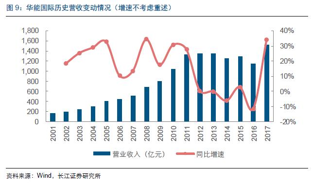 由于裝機(jī)容量的提升,華能國(guó)際自2001 年上市以來(lái)發(fā)電量和營(yíng)業(yè)收入基本上保持著穩(wěn)步提升的趨勢(shì)。主要的例外發(fā)生在2013、2014 和2016