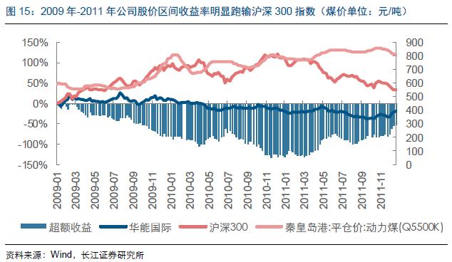 通過(guò)研究煤炭?jī)r(jià)格變動(dòng)對(duì)于公司股價(jià)走勢(shì)的影響,并按照煤炭?jī)r(jià)格波動(dòng)周期對(duì)公司股價(jià)相較滬深300 指數(shù)的超額收益進(jìn)行詳細(xì)拆分研究后可以發(fā)現(xiàn):