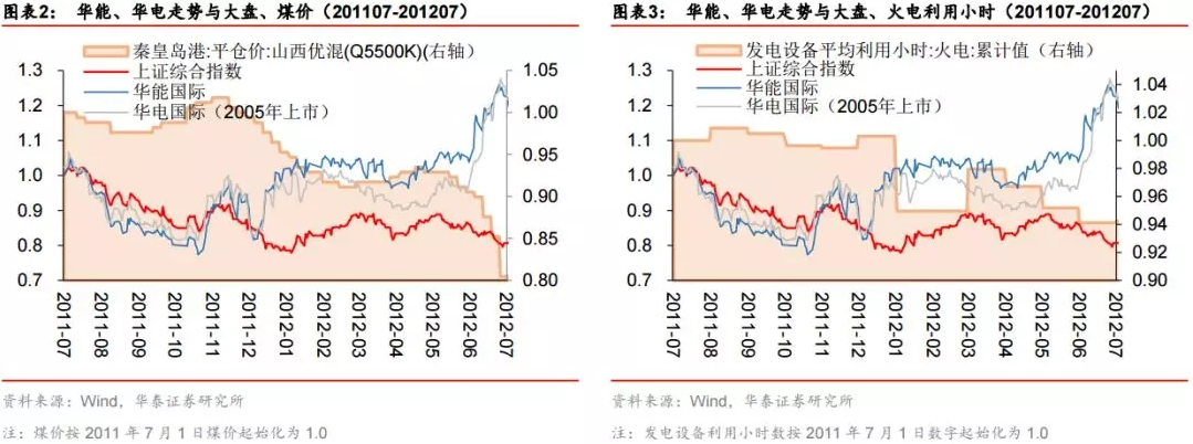 1)2011 年 7 月-2012 年 7 月的防御性體現,華電國際上漲 35%,華能國際上漲 36%(同期上證指數下跌 21%),當時煤價下跌 27%, 利用小時數緩跌 6%;