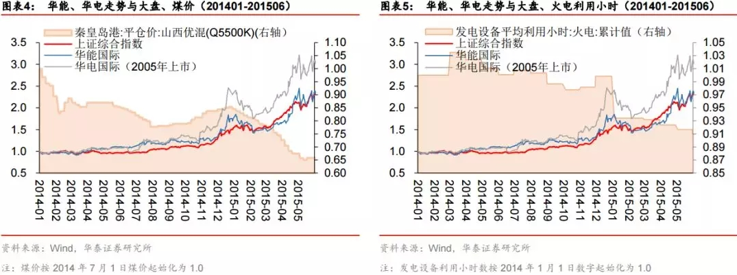2)2014 年 1 月-2015 年 6 月的進攻性,華電國際上漲 251%,華能國際上漲 159%(同期上證指數上漲 136%),當時煤價累 計下跌 34%,利用小時數緩跌 9%。