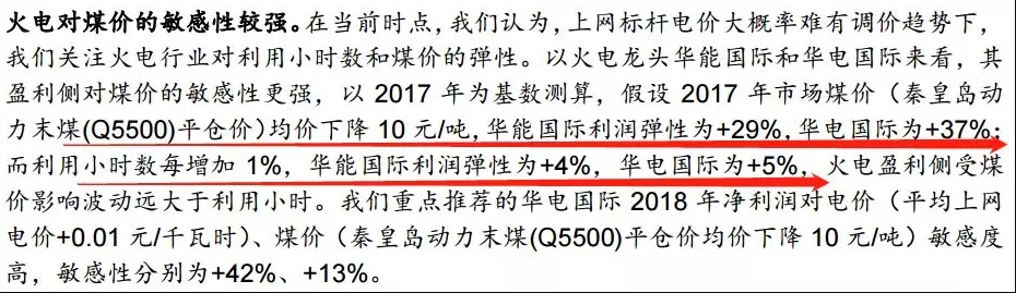與 2011/2014 相似的是,本輪煤價自 2016 年下半年高位運行,火電盈利進入“寒冬”;煤電聯動“千呼萬喚始不出來”,基本面和相對估值位于底部。4Q17 火電幾乎全行業(yè)虧損,上市公司業(yè)績對煤價敏感性強,龍頭華能國際、華電國際的利潤彈性為 29%/37%(17 年煤價 10 元/噸的波動) vs 對電量的敏感性 4%/5%(17 年利用小時數 1%的波動);華電國際在 18 年煤價-10 元/噸的假設下,利潤+13%。我們認為,一旦煤價下行趨勢確立,煤價下跌帶給火電業(yè)績的增厚可觀。