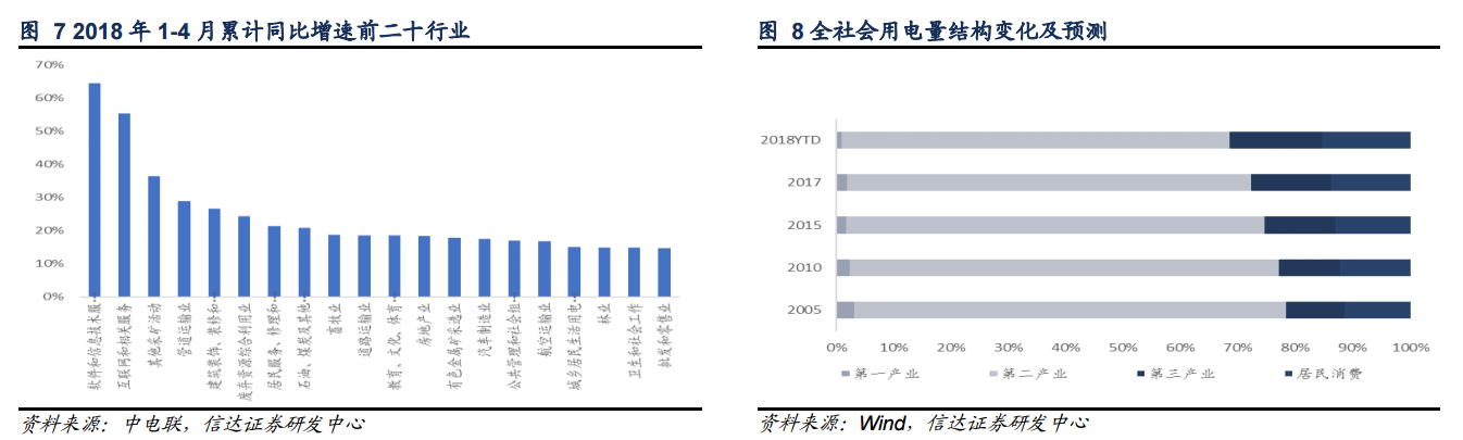 用電量貢獻(xiàn)增量由第二產(chǎn)業(yè)占主導(dǎo),近 8 年來第二產(chǎn)業(yè)貢獻(xiàn)增量都超過 58%,但同時,二產(chǎn)對全社會用電量增長貢獻(xiàn)率,從 2007 年接近 90%,到 2017 年已經(jīng)不足 60%;隨著第三產(chǎn)業(yè)飛速發(fā)展,第三產(chǎn)業(yè)用電量貢獻(xiàn)增量越來越多;城鄉(xiāng)居民用電量增量貢獻(xiàn)提升至約 20%;第一產(chǎn)業(yè)用電量貢獻(xiàn)增量穩(wěn)步在較低區(qū)間。