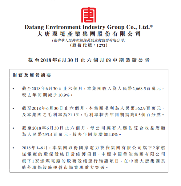 大唐環(huán)境(01272 HK)宣布,截至2018年6月30日止6個(gè)月,公司實(shí)現(xiàn)收入為人民幣26 69億元(單位下同),較去年同期減少10 9%;毛利為5 63億元,及