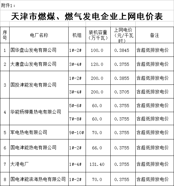 ˙燃煤和燃?xì)獍l(fā)電機(jī)組上網(wǎng)電價(jià)表