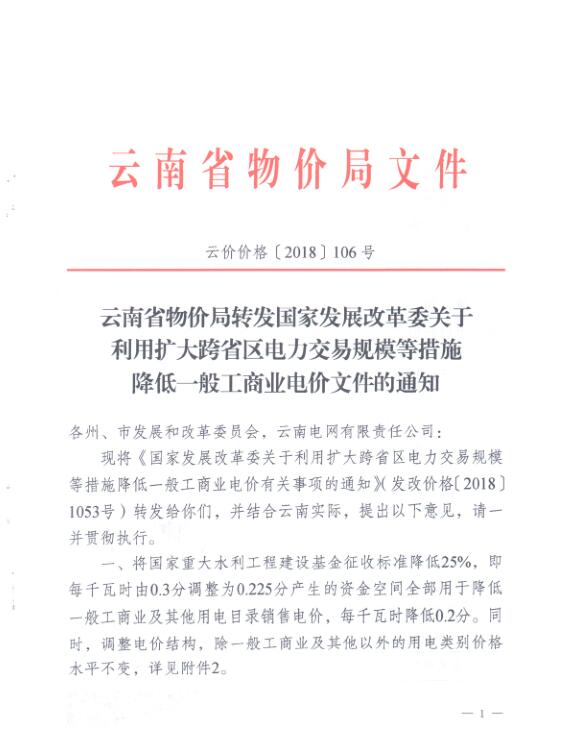 云南省物價局日前發(fā)布了《轉(zhuǎn)發(fā)國家發(fā)改委關(guān)于利用跨省區(qū)電力交易規(guī)模等措施降低一般工商業(yè)電價文件的通知》,將國家重大水利工程建設(shè)基金征