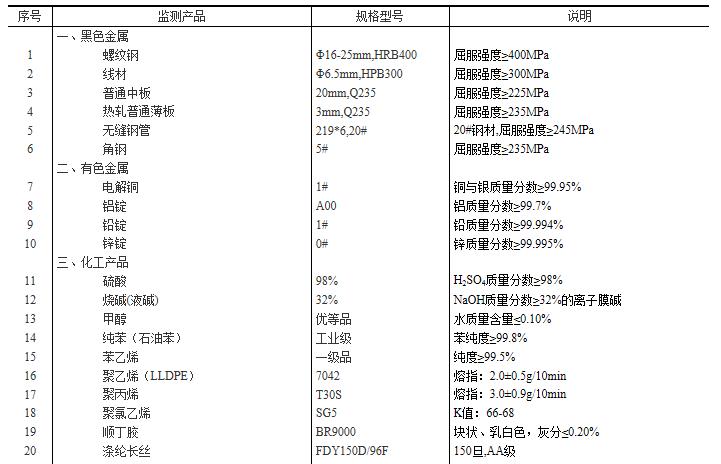流通領域重要生產(chǎn)資料市場價格監(jiān)測內(nèi)容包括9大類50種產(chǎn)品的價格。類別與產(chǎn)品規(guī)格說明詳見附表。