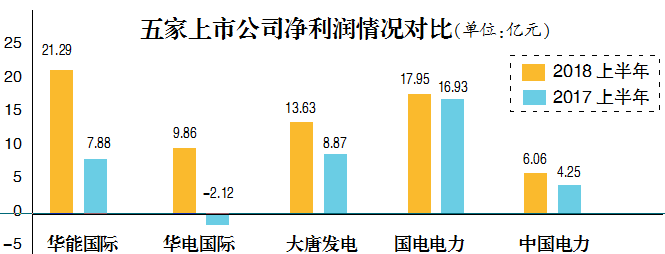2017年上半年,華電國(guó)際凈虧損2.12億元,其余四家凈利潤(rùn)額也大幅下降;而今年上半年,由于煤電經(jīng)營(yíng)壓力相對(duì)減小,各公司凈利潤(rùn)均較上年同期有明顯改善。華能?chē)?guó)際上半年凈利潤(rùn)錄得21.29億元,較上年同期大幅增長(zhǎng)約170%,規(guī)模優(yōu)勢(shì)得以體現(xiàn);華電國(guó)際也順利扭虧為盈,凈利潤(rùn)為9.86億元。