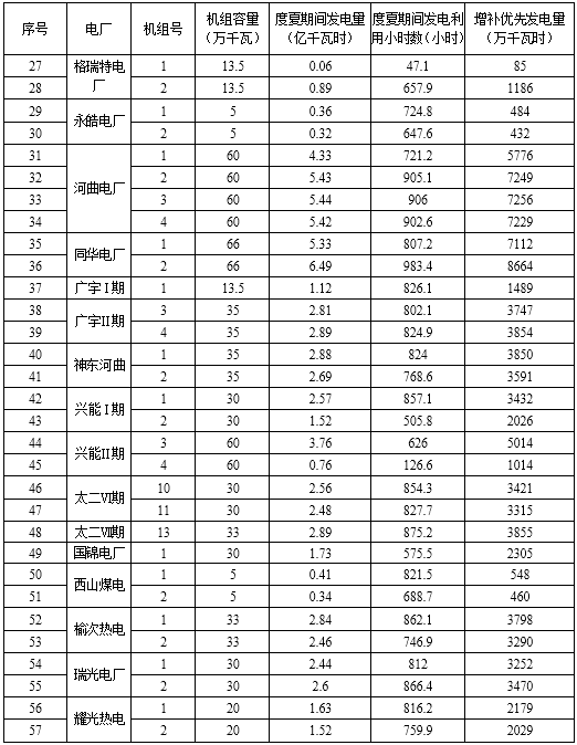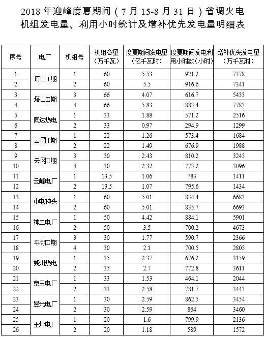 山西:2018年迎峰度夏期間省調(diào)火電機(jī)組發(fā)電量、利用小時(shí)統(tǒng)計(jì)及增補(bǔ)優(yōu)先發(fā)電量明細(xì)
