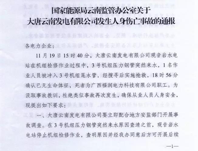 國家能源局云南監(jiān)管辦公室發(fā)布了關(guān)于大唐云南發(fā)電有限公司發(fā)生人身傷亡事故的通報(bào),大唐云南發(fā)電有限公司觀音巖水電站在機(jī)組檢修作業(yè)過程中,3號機(jī)組壓力鋼管突然來水,1名作業(yè)人員被沖入3號機(jī)組尾水管,經(jīng)搜尋后實(shí)施搶救,18時(shí)56分確認(rèn)已無生命體征