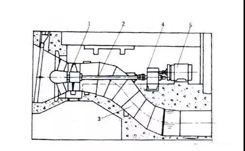 1—轉(zhuǎn)輪;2—水輪機(jī)主軸;3—尾水管;4—齒輪轉(zhuǎn)動(dòng)機(jī)構(gòu);5—發(fā)電機(jī)