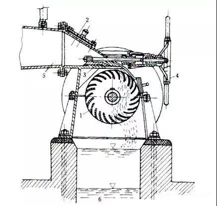 1—工作輪;2—噴嘴;3—調(diào)節(jié)閘板;4—舵輪;5—引水管;6—尾水槽