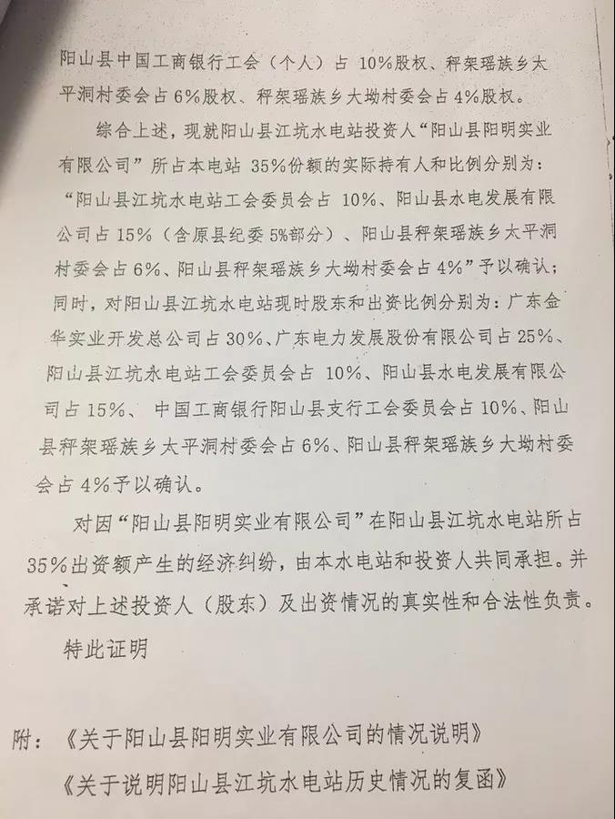 根據(jù)陽山縣江坑水電站股東會議于1994年12月1日通過的水電站章程及銀行付款憑證,廣東金華實業(yè)開發(fā)總公司投入江坑水電站的初始資金為600萬元,根據(jù)陽山縣江坑水電站董事會決議,1996年分紅擴股85.10萬元,2014年和2015年投入增效擴容資金206.459158萬元。廣東金華實業(yè)開發(fā)總公司投資陽山江坑水電站金額共計8,915,591.58元,股比份額30%。