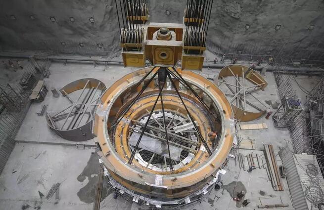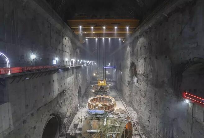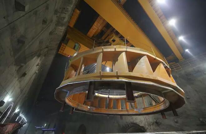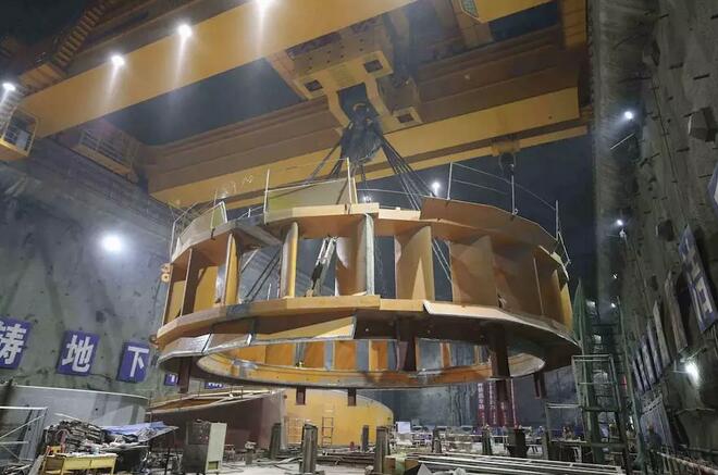 3月25日,烏東德水電站工程右岸地下電站最后一臺機(jī)組座環(huán)順利吊入機(jī)坑。(來源:中國三峽集團(tuán))至此,歷時380天,烏東德水電站工程的12臺機(jī)