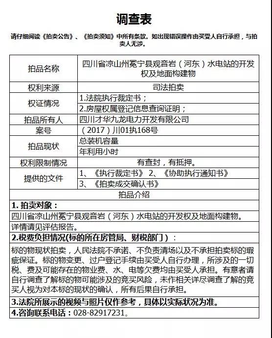 拍賣 | 四川涼山冕寧縣觀音巖(河東)水電站的開發(fā)權及地面構(gòu)建物 10月11日開拍