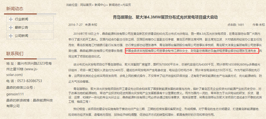其中晶森能源官網上有一則新聞很有意思,其中稱,上面提過的蔣竚、張玉濤的職位分別是中國金森資本控股有限公司財務副總裁、融資租賃事業(yè)部總經理,江燕秋為董事會秘書,而金森資本是于2016年5月注冊于香港的金融投資公司。