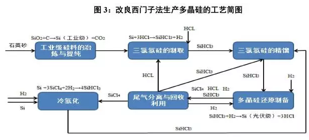 多晶硅的制作流程大致為:通過(guò)冶煉工藝將SiO₂冶煉還原為98%純度的工業(yè)Si,再通過(guò)改良西門子法或者硅烷流化床法進(jìn)一步把工業(yè)級(jí)Si提純到99.9999%的太陽(yáng)能級(jí)多晶硅。由于提純純度要求高并且還原過(guò)程高載能,這也使得硅料成為晶硅光伏電池能耗最大的一個(gè)環(huán)節(jié)。幾年前的技術(shù)水平,還原1kg多晶硅需要120度電,這些年伴隨著技術(shù)進(jìn)步,提煉1kg的多晶硅的能耗越來(lái)越低,一線廠家1kg多晶硅提煉僅需要60度電;與此同時(shí),一大批廠家在應(yīng)用“硅烷流化床”這項(xiàng)革命性的技術(shù),可以把1kg硅料的電耗降低到25度電。