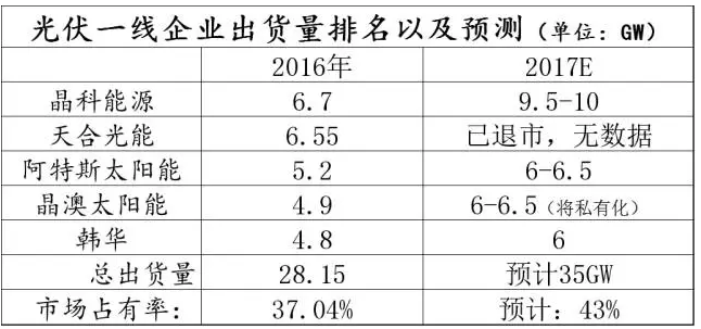 前五大光伏組件產(chǎn)業(yè)去年總出貨量28.15GW,占去年總銷售量的37.04%,今年前五大企業(yè)預(yù)計(jì)出貨量會(huì)達(dá)到35GW,市場(chǎng)占有率會(huì)進(jìn)一步提升至43%,其中晶科能源增長(zhǎng)最為迅速(負(fù)債率也相對(duì)偏高),預(yù)計(jì)2017年將會(huì)穩(wěn)固光伏一哥的位置。這其中天合光能已經(jīng)于去年退市,晶澳太陽(yáng)能也提出了私有化邀約(6.8$)且這個(gè)私有化邀約沒(méi)比當(dāng)前股價(jià)(6.5$)高多少,除非撤銷要約或者邀約不通過(guò),不然晶澳太陽(yáng)能上漲空間有限。剩下的幾大巨頭表現(xiàn)都非常好,而且即便經(jīng)過(guò)這一輪暴漲,大部分公司股價(jià)依舊在凈資產(chǎn)一下,算是價(jià)值發(fā)現(xiàn)的一輪行情。