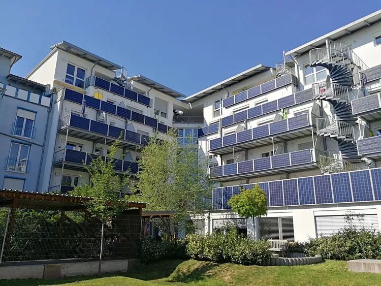 右側(cè)樓宇頂樓立面安裝了光伏,朝向為西。2-6層的陽臺上是頭像。