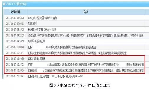 針對A電站9月17日的非正常運(yùn)行時間段,快速查看當(dāng)天的值長日志,如圖5所示:因電站10KV I段母線C相金屬性接地故障排查工作,于9月17日12:10停運(yùn)10KV I段母線,并向省調(diào)匯報。