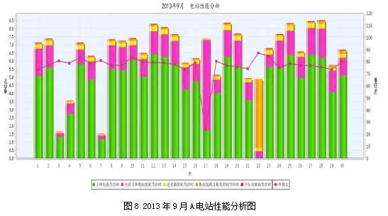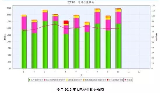 仍然以我國西北地區(qū)光伏電站A的生產(chǎn)運(yùn)行數(shù)據(jù)為例,2013年度電站性能分析情況如圖7所示: