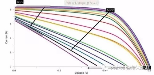 晶硅組件發(fā)生PID后,其I-V曲線形狀會出現(xiàn)異常,電性能參數(shù)表現(xiàn)為Rsh、填充因子和開路電壓Voc的降低。PID越嚴重,其曲線移動的趨勢就如圖15箭頭所示。而對于輕微PID組件,其IV曲線的異常特征不太明顯,還需結合下面的方法(開路電壓法、EL)進行綜合分析。