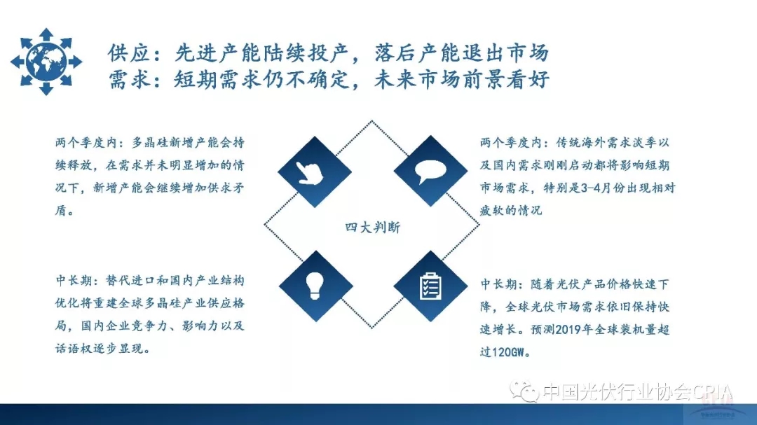 2019年1月17日,在中國光伏行業(yè)協(xié)會主辦的“光伏行業(yè)2018年發(fā)展回顧與2019年形勢展望研討會”上,中國有色金屬工業(yè)協(xié)會硅業(yè)分會副秘書長馬海天作2018年多晶硅市場現(xiàn)狀與發(fā)展趨勢報告。馬海天在報告中提到,受需求和新政影響,2018年全年多晶硅價格一路下跌,因此月度產(chǎn)量和企業(yè)產(chǎn)量分化明顯;受中國光伏終端需求縮減影響,多晶硅累計進口量近十年來首年同比下降,但是多晶硅產(chǎn)能擴張期仍在繼續(xù)。馬海天重點指出了多晶硅產(chǎn)業(yè)發(fā)展中的產(chǎn)能過剩和產(chǎn)品品質(zhì)問題,并預(yù)測需求和供應(yīng)不利情況在2019年上半年可能會共振出現(xiàn),下半年逐步好轉(zhuǎn),同時市場供應(yīng)可能會出現(xiàn)大幅波動,海外企業(yè)將退出。根據(jù)馬海天的總結(jié),我國的多晶硅和光伏在快速發(fā)展過程中面臨著不少貿(mào)易糾紛,但是我國目前的多晶硅和光伏產(chǎn)業(yè)處于領(lǐng)先地位,未來前景光明。
