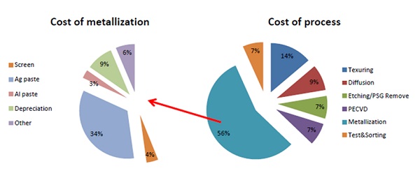 (3)降低成本與節(jié)省用量勢在必行:正銀漿料雖然對于電池轉換效率具有重要的影響性,但是除了硅片以外,也是電池片生產(chǎn)所需最多的材料,超過了10%的成本比重。因為隨著電池片的售價趨勢逐漸下滑,所以如何降低正銀的制造成本,或是配合網(wǎng)版或工藝技術節(jié)省生產(chǎn)的正銀用量,會是供應商在材料研發(fā)上或是面對客戶要求時的必要條件之一。