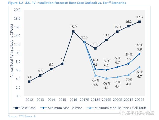 美國(guó)光伏制造商Suniva和SolarWorld兩家公司向美國(guó)國(guó)際貿(mào)易委員會(huì)和特朗普總統(tǒng)提出申請(qǐng),要求所有光伏電池的進(jìn)口加收0.40美元/瓦的關(guān)稅,并且對(duì)多晶光伏組件設(shè)立0.78美元/瓦的最低進(jìn)口價(jià)。如果二者同時(shí)實(shí)施,那么美國(guó)光伏價(jià)格將達(dá)到1.18美元/瓦,回到2012年的水平。根據(jù)GTM Research的分析,如果對(duì)光伏組件進(jìn)口實(shí)施0.78美元/瓦的最低價(jià)格,那么美國(guó)的2018-2022年之間的預(yù)期的新增累計(jì)光伏裝機(jī)將從72.5吉瓦降至36.4吉瓦;如果再加上對(duì)光伏電池加收的0.40美元/瓦的關(guān)稅,那么在1.18美元/瓦的價(jià)格下,2018-2022年預(yù)期的新增累計(jì)裝機(jī)將降低至25吉瓦。也就是說,美國(guó)有可能損失高達(dá)47.5吉瓦的光伏安裝量,大致相當(dāng)于美國(guó)現(xiàn)有的光伏裝機(jī)容量。