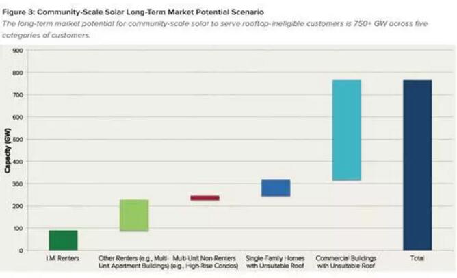 根據落基山研究所的最新報告,美國無法安裝屋頂太陽能設備的家庭和商業(yè)建筑所需的社區(qū)規(guī)模太陽能市場潛在規(guī)模達到了750GW以上。(見下圖)