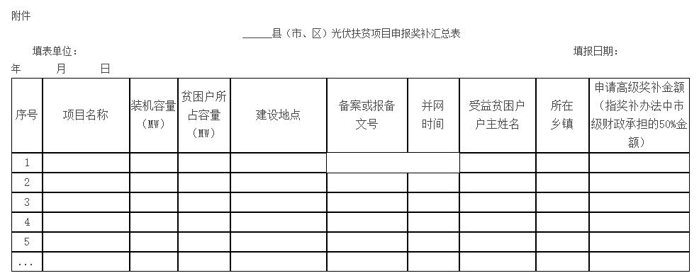 3.《光伏扶貧項(xiàng)目申報獎補(bǔ)匯總表》以本文件所附表格為準(zhǔn)。