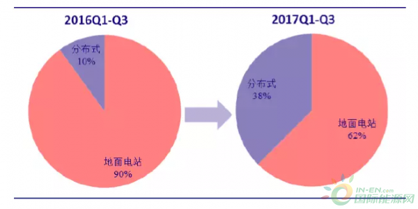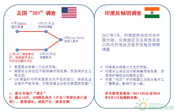 光伏作為朝陽(yáng)性、戰(zhàn)略性、民生性占優(yōu)勢(shì)的產(chǎn)業(yè),已具備了極強(qiáng)的國(guó)內(nèi)影響力和較強(qiáng)的國(guó)際競(jìng)爭(zhēng)力。美國(guó)和印度是全球第二大和第三大光伏市場(chǎng)。2017年前三季度,我國(guó)分別向美國(guó)、印度出口光伏組件3.735GW、6.877GW,占出口總量的20.3%、37.5%。2017年中旬起,美、印相繼對(duì)我國(guó)光伏產(chǎn)品發(fā)起反傾銷調(diào)查,調(diào)查結(jié)果可能導(dǎo)致2018年出口量驟減,而今年很多行業(yè)龍頭都在大力擴(kuò)產(chǎn)能,龐大的產(chǎn)能將難以借外需充分釋放。在美、印市場(chǎng)面臨嚴(yán)重收縮的前提下,2018年國(guó)內(nèi)分布式光伏或?qū)⒊蔀榍藙?dòng)產(chǎn)業(yè)的新支點(diǎn)。