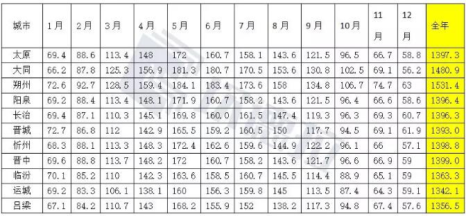 ▼山西地級(jí)市太陽(yáng)輻射情況匯總表(水平面)