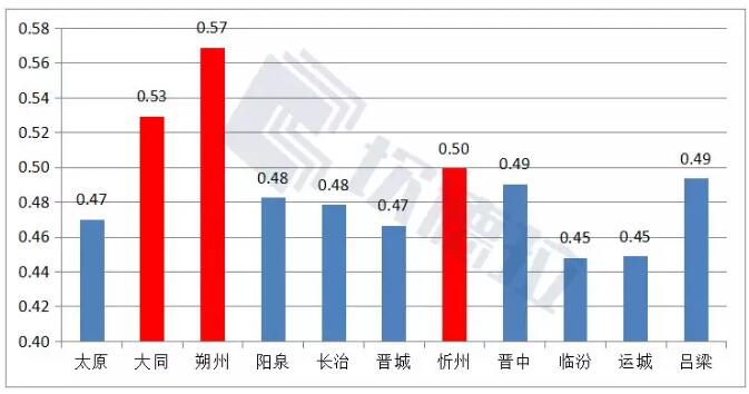 根據(jù)上述圖表,可知,太原、陽(yáng)泉、長(zhǎng)治、晉城、晉中、臨汾、運(yùn)城、呂梁均屬于中等級(jí)別。大同、朔州、忻州屬于高級(jí)別。