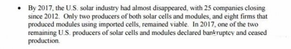 在2017年,美國(guó)的光伏制造業(yè)幾乎已經(jīng)消失,從2012年開始有25家美國(guó)光伏制造業(yè)關(guān)門/倒閉。在2017年,整個(gè)美國(guó)僅有兩家公司制造太陽(yáng)能電池和組件,有8家公司制造組件,但用的是進(jìn)口的太陽(yáng)能電池。結(jié)果很慘的是,在2017年調(diào)查的過程中,上面僅有的兩家制造太陽(yáng)能電池和組件中的一家公司,宣布了破產(chǎn)。