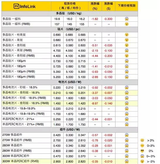 我們看到,正是在這樣的政策環(huán)境下,疊加短期的供應(yīng)需求關(guān)系(中國(guó)也是傳統(tǒng)的淡季),目前光伏各個(gè)環(huán)節(jié)的價(jià)格,出現(xiàn)了下滑,其中下滑最厲害的便是電池片環(huán)節(jié)。根據(jù)PVInfoLink的價(jià)格顯示: