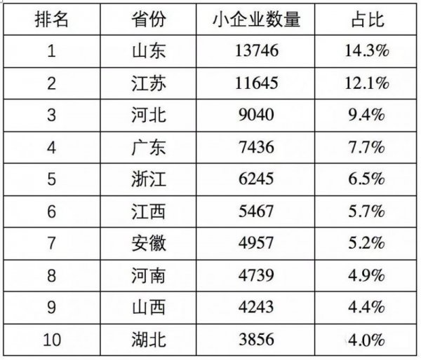 從上圖中可以看出,山東、江蘇、河北是全國(guó)小型光伏企業(yè)最多的地方。山東省接近1.4萬(wàn)家,江蘇超過(guò)1萬(wàn)家。前10名的省份如下表所示。