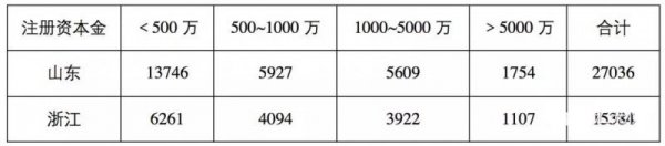 從上表可以看出,注冊(cè)資本金在500萬(wàn)元以上的企業(yè),山東和浙江的數(shù)量基本相當(dāng)。然而,500萬(wàn)元以下的小企業(yè)數(shù)量,山東明顯高于浙江。