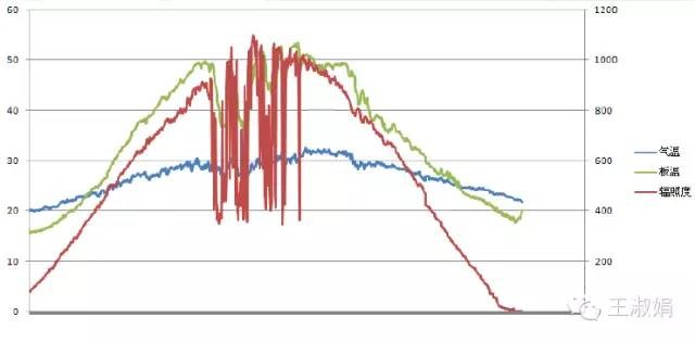 上圖中,電池板溫度(綠線)最多的時候能比環(huán)境溫度(藍線)高出25℃。據(jù)文獻介紹,在青海正午輻照度最好的時間,電池板溫度甚至能比環(huán)境溫度高出近30℃。