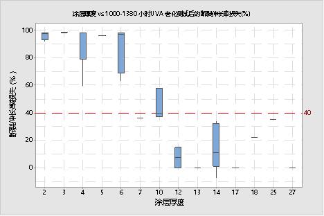 圖5. 斷裂伸長(zhǎng)率損失率與背板內(nèi)層厚度(um)的關(guān)系——當(dāng)接受1000-1380小時(shí)的紫外照射后,如果內(nèi)層厚度<10um,背板斷裂伸長(zhǎng)率將損失嚴(yán)重。