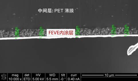 圖6. 某PVDF/PET/FEVE背板內(nèi)層FEVE涂層只有1.3微米
