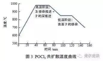 APCVD技術(shù)制備雙面電池的關(guān)鍵之處在于使用POCl3進行硼磷的共擴散。硼元素的擴散溫度比磷元素的擴散溫度高,其主要的擴散溫度區(qū)間為900~1000℃[3,4]。在擴散爐管內(nèi)先高溫達到硼擴散的溫度,再降溫至磷擴散溫度。采用如圖3的溫度曲線進行共擴散。