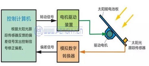 主動(dòng)式跟蹤控制根據(jù)控制計(jì)算機(jī)預(yù)先存儲(chǔ)的當(dāng)?shù)亟?jīng)緯度等數(shù)據(jù)與太陽運(yùn)動(dòng)的軌跡函數(shù),再根據(jù)實(shí)時(shí)時(shí)鐘的精確時(shí)間信號(hào),按地平坐標(biāo)系相關(guān)函數(shù)計(jì)算出實(shí)時(shí)的太陽高度角與方位角,發(fā)出控制信號(hào)。電池板的軸系驅(qū)動(dòng)部件根據(jù)這些信號(hào)把電池板轉(zhuǎn)向指定的高度角與方位角,從而對(duì)準(zhǔn)太陽。在整個(gè)控制過程中無需檢測(cè)電池板是否對(duì)準(zhǔn)了太陽,直接發(fā)控制命令,所以是主動(dòng)式控制。由于控制過程不檢測(cè)太陽位置,不是根據(jù)檢測(cè)到的太陽位置偏差進(jìn)行控制的,在自動(dòng)控制技術(shù)中稱為開環(huán)控制。