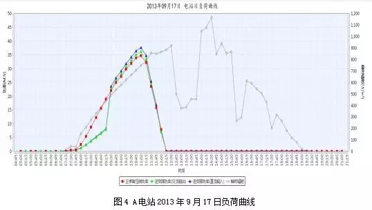 2013年9月17日電站的上網(wǎng)電量僅為8.67萬千瓦時(shí),綜合利用效率為9月份最低水平,僅為23.36%。進(jìn)一步分析9月17日電站的生產(chǎn)運(yùn)行數(shù)據(jù),對(duì)比逐15分鐘的電站瞬時(shí)輻射、逆變器直流功率、逆變器交流功率和電站實(shí)際出力數(shù)據(jù),發(fā)現(xiàn)從中午12:15開始,逆變器直流功率、逆變器交流功率和電站實(shí)際出力數(shù)據(jù)都降為0,電站處于非正常運(yùn)行狀態(tài),如圖4所示: