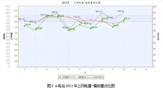 圖2中的綠色曲線為A光伏電站2013年度各月的上網(wǎng)電量,灰色曲線代表輻射量,紅色三角曲線為電站的綜合利用效率,灰色陰影帶為75%-85%的電站綜合利用效率合理范圍,當(dāng)電站綜合利用效率低于75%時(shí),說明太陽能資源利用率低,電量損失嚴(yán)重,電站效益較差。