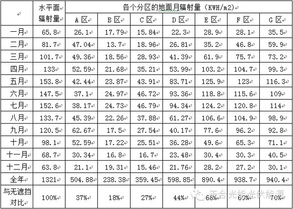 給出了各個(gè)分區(qū)一年內(nèi)各個(gè)月份的光資源分析。由于光伏電站無遮擋規(guī)定的時(shí)間為當(dāng)?shù)卣嫣?yáng)時(shí)冬至日9:00—15:00之間,因此冬季農(nóng)作物的高度要低于前排組件上端到后排組件下端兩者之間的連線。這一連線,也就是農(nóng)業(yè)大棚棚頂?shù)脑O(shè)計(jì)依據(jù)。