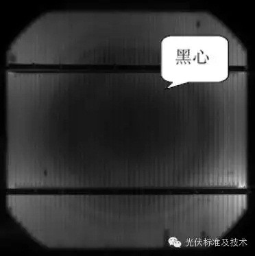 (1)產(chǎn)生原因:在直拉硅棒生產(chǎn)過程中,晶體定向凝固時間縮短,熔體潛熱釋放與熱場溫度梯度失配,晶體生長速率加快,過大的熱應力導致硅片內(nèi)部位錯缺陷。(2)成像特點:黑芯或黑團片在EL成像圖中可以清晰的看到從電池片中心到邊緣逐漸變亮的同心圓,從而導致缺陷的部分在EL測試過程中表現(xiàn)為發(fā)光強度較弱或不發(fā)光。從而形成復合密集區(qū),在通電情況下電池片中心一圈呈現(xiàn)黑色區(qū)域。如圖4、5所示。(3)組件影響:組件出現(xiàn)此缺陷后,長時間運行,會造成熱擊穿;在使用組件測試儀測試組件IV測試特性曲線時,測試曲線呈現(xiàn)臺階形狀;同時長時間運行會導致組件功率下降。