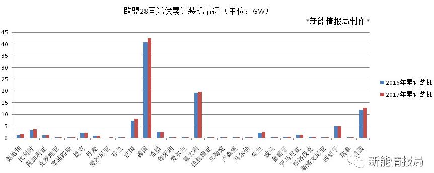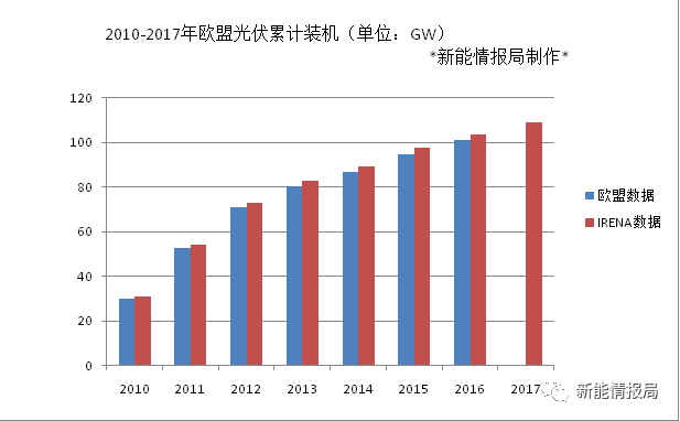 根據(jù)IRENA的數(shù)據(jù),截止2017年底,歐盟累計(jì)光伏裝機(jī)為108.854GW,而2016年這一數(shù)字為103.512GW(歐盟自己的統(tǒng)計(jì)2016年光伏累計(jì)裝機(jī)數(shù)據(jù)為100.812GW)。