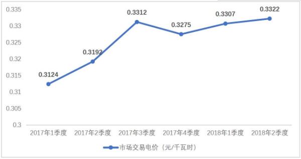 2017年以來(lái),隨著煤炭市場(chǎng)價(jià)格波動(dòng)拉升以及市場(chǎng)交易的理性回歸,煤電市場(chǎng)交易電價(jià)呈緩步回升趨勢(shì)。2018年2季度,大型發(fā)電集團(tuán)煤電市場(chǎng)交易平均電價(jià)為0.3322元/千瓦時(shí),同比回升4.07%。