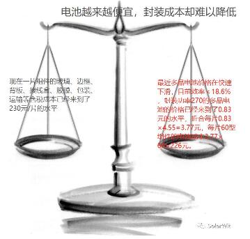 近來(lái)隨著多晶電池片價(jià)格的不斷下跌,發(fā)生了一件具有歷史意義的事情,那就是一片60型組件的電池成本已經(jīng)低于封裝成本。未來(lái)組件價(jià)格下滑很難再依靠電池價(jià)格的下滑?,F(xiàn)在一張效率<18.6%的多晶電池片的價(jià)格約為3.77元;那么一片組件所需的60張電池片成本為3.77×60=226元。而現(xiàn)在一片組件的含稅成本已經(jīng)高達(dá)185×1.16=214.6元。